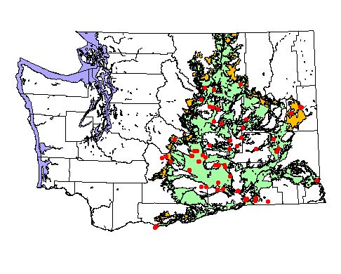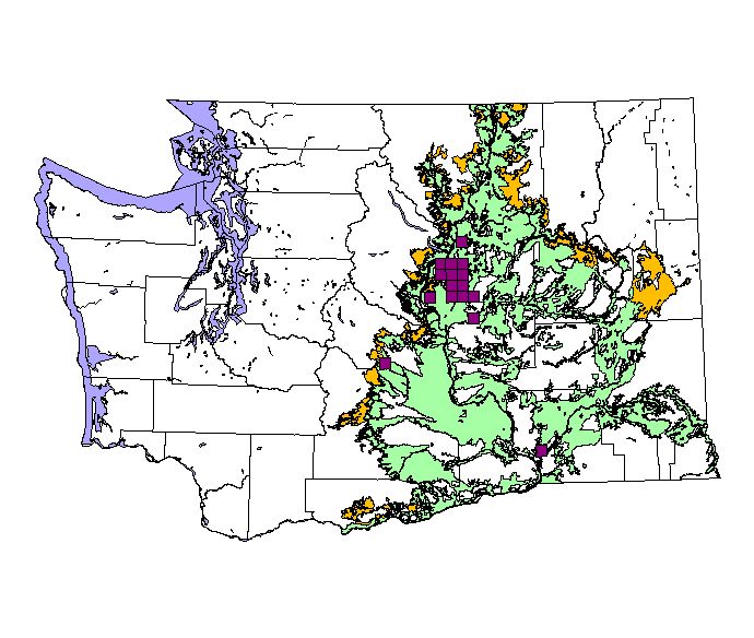 Washington Gap Analysis Project point locations All observations between 1800's - 1995 Historic record locations: 78 Total number of records: 96 |