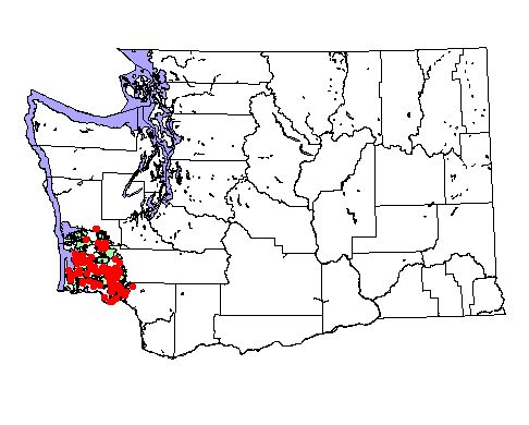 Washington Gap Analysis Project point locations All observations between 1800's - 1995 Historic record locations: 143 Total number of records: 195 |