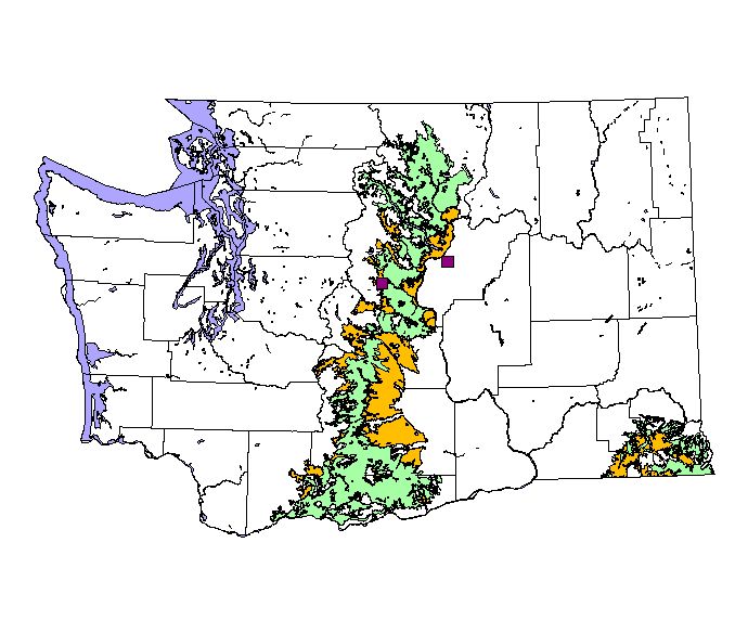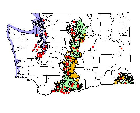 Washington Gap Analysis Project point locations All observations between 1800's - 1995 Historic record locations: 86 Total number of records: 130 |