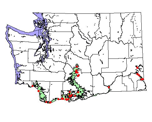 Washington Gap Analysis Project point locations All observations between 1800's - 1995 Historic record locations: 35 Total number of records: 38 |