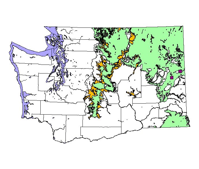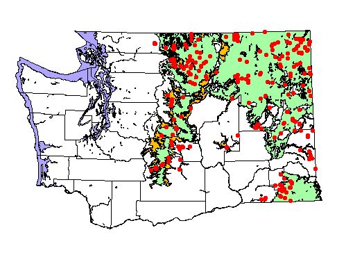 Washington Gap Analysis Project point locations All observations between 1800's - 1995 Historic record locations: 245 Total number of records: 416 |