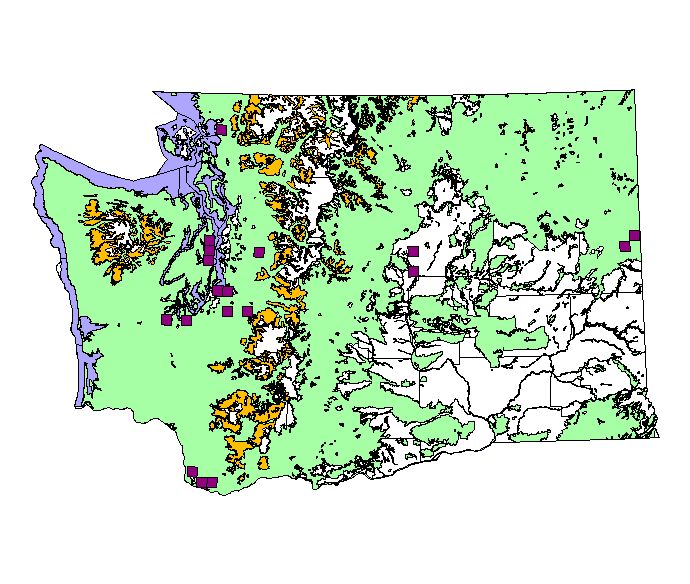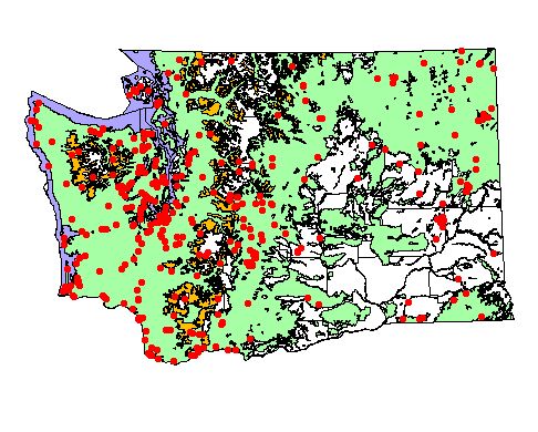 Washington Gap Analysis Project point locations All observations between 1800's - 1995 Historic record locations: 339 Total number of records: 556 |