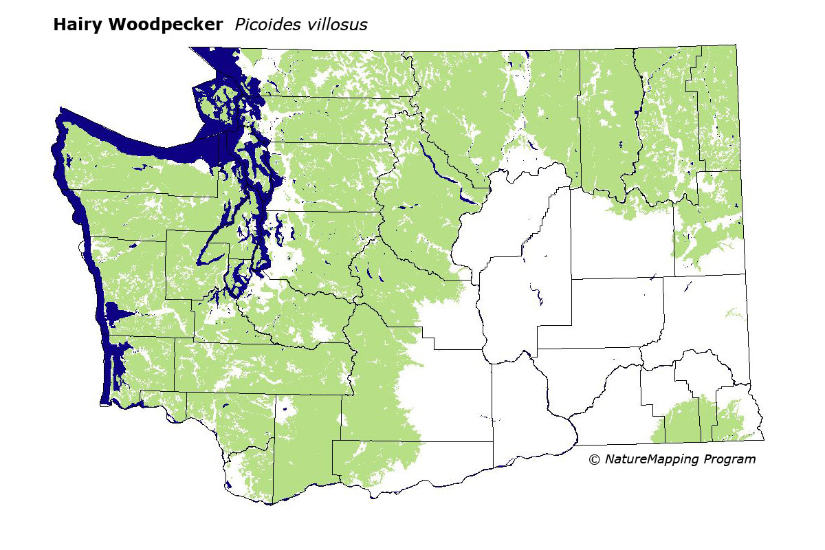 Three subspecies breed in Washington: P. v. monticola in far eastern Washington, P. v. orius of the Cascades, and P. v. harrisi of western Washington. The Hairy Woodpecker and Downy Woodpecker have neatly divided the state based on their individual tree preferences: Downy Woodpeckers prefer hardwood trees while Hairy Woodpeckers prefer coniferous trees. Thus the Hairy Woodpeckers is found in virtually every zone where coniferous trees are the dominate taxa. At higher elevations, forest communities become almost entirely coniferous (even riparian corridors), so Downy Woodpeckers are usually absent, except occasionally at burns. The Hairy Woodpecker may be found even in high boreal forests, often alongside its boreal counterpart, the Three-toed Woodpecker. In the Puget Trough, where conifer trees have largely been replaced by hardwoods, Hairy Woodpeckers are uncommon and mostly replaced by Downy Woodpeckers.