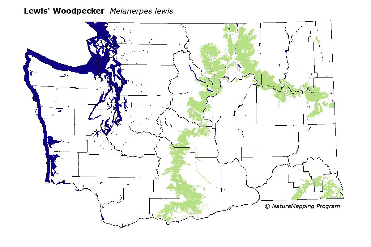 Lewis' Woodpeckers were once fairly common in western Washington, invading burns and utilizing prairie habitats. Several sites have been listed where this birds has been recorded during the breeding season: Blaine, Bellingham, Cathlamet, Vancouver, Carson, the Olympic Peninsula, Ocosta, Long Beach, Redmond, and Kirkland. In 1987 they were recorded as a former uncommon breeder in the San Juan Islands, but now a rare migrant or winter visitor. Modern forest-management practices have replaced the natural pattern of burns in western Washington forests with cuts, and nest-site competition has increased with the invasion of the European Starling. These events have virtually eliminated Lewis' Woodpeckers from western Washington, where they are now a rare species with no known breeding records. In eastern Washington, this species is mostly restricted to the transition zone between the Ponderosa Pine forests and sagebrush zones, where it utilizes the large hardwood groves found along riparian corridors. Away from this transition zone, in the central Columbia Basin, Lewis' Woodpecker are scarce. Little evidence of nesting is known from this area, though a pair was seen several times in a riparian grove six miles northwest of Ephrata in Douglas County, during the entire breeding season in 1992, and again in May 1995. To the northeast, in Stevens, Pend Oreille, and Lincoln Counties, this species is an uncommon breeder. In Spokane County, where it was formerly common, starling competition and habitat destruction have reduced numbers drastically. Similar conditions have caused the extirpation of Lewis' Woodpeckers in most of Walla Walla County, and possibly in Columbia County. Records in Asotin County may indicate a lingering breeding population in the Blue Mountains region. Experts consider Lewis' Woodpecker to be a summer resident in stream-side habitats in the Blue Mountains.