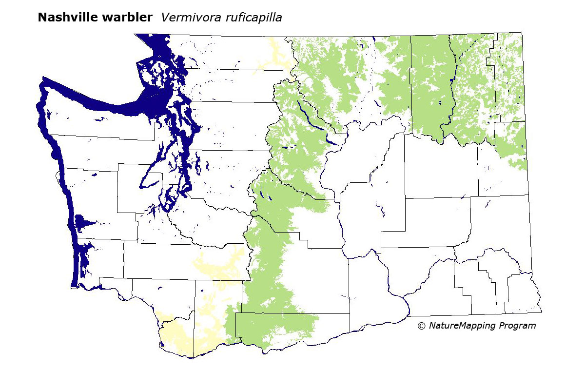 The Nashville Warbler is common in exposed micro-habitats in eastern Washington conifer forests, mostly at lower elevations. In western Washington it is fairly common along the upper Skagit River in eastern Skagit and Whatcom Counties, and locally common in scattered pockets in Skamania and Clark Counties. It possibly is a rare breeder in the Blue Mountains.